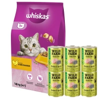 WHISKAS Ξηρά τροφή για γάτες 1+ με κοτόπουλο 14kg + WILD FARM Premium Grain Free Chicken and Sprats 6x400g
